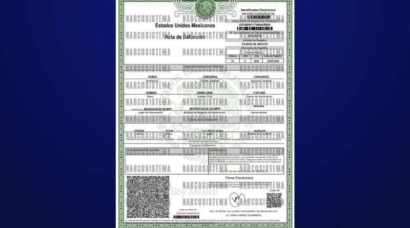 Read MoreAgencia Reforma Ciudad de México 28 febrero 2026.- El acta de defunción de Rubén Oseguera Cervantes, «El Mencho» establece que murió por múltiples