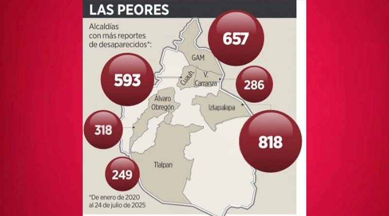 Ciudad de México 27 julio 2025.- Tlalpan es prioritaria para la Comisión de Búsqueda, pero en la Ciudad de México suman seis Alcaldías en alerta por desapariciones e incluyen también a las de Venustiano Carranza, Álvaro Obregón, Cuauhtémoc, Gustavo A. Madero e Iztapalapa.