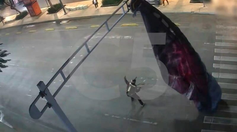 Las cámaras de vigilancia del C5 captaron el momento en el que el paracaídas del hombre, de 36 años, queda atrapado en la estructura ubicada enfrente de Plaza de la Solidaridad, en el cruce de Avenida Juárez y Balderas, cuando el sujeto iba en descenso.