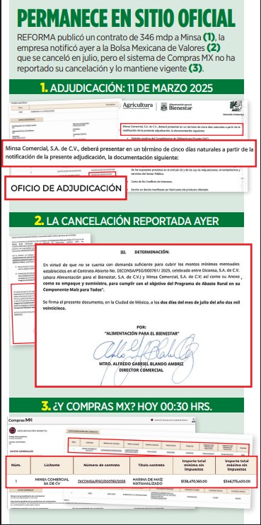 Ciudad de México 9 diciembre 2025.- Tras la difusión este martes de que Diconsa le adjudicó en marzo pasado un contrato por 346 millones de pesos, la empresa Minsa de Altagracia Gómez notificó ayer a la Bolsa Mexicana de Valores (BMV) que este convenio fue cancelado en julio pasado «sin que mediara un solo Peso para la compañía».