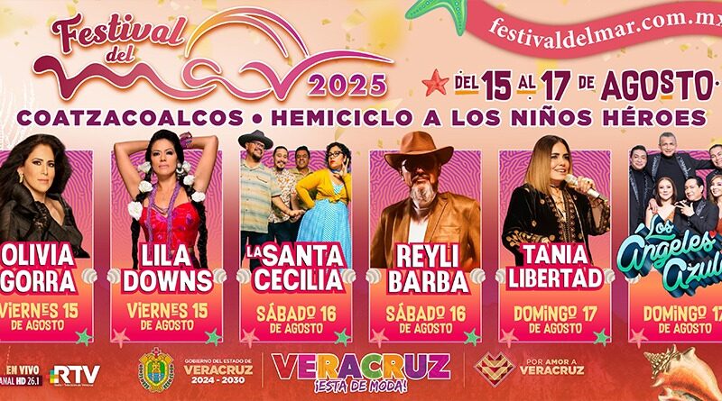 Xalapa, Ver., 27 julio 2025.- El Gobierno del estado de Veracruz celebrará del 15 al 17 de agosto el Festival del Mar en Coatzacoalcos, evento que integra reflexión, cultura y música con la participación de reconocidas figuras del arte nacional e internacional.