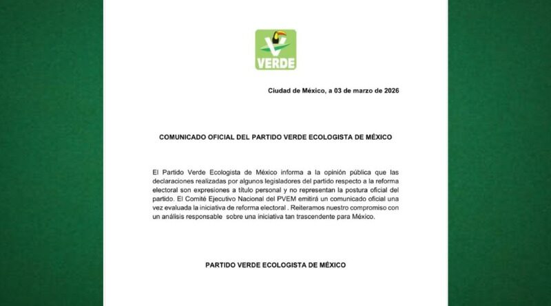 Read MoreAgencia Reforma Ciudad de México 3 marzo 2026.- El Partido Verde Ecologista de México (PVEM) se deslindó este martes de