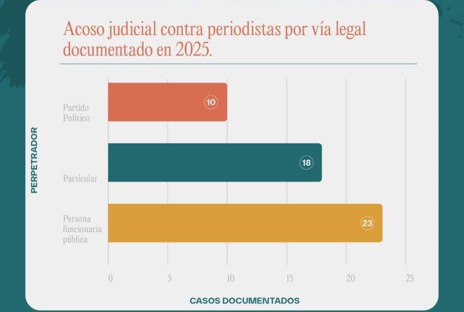 En los últimos 10 años, resaltó, el número más alto de acciones judiciales había alcanzado 40 en 2021, cifra ya superada en tan solo siete meses de este año, lo que revela que la violencia contra la prensa ya no se limita a agresiones físicas o amenazas: ahora se traslada a los tribunales mediante demandas, denuncias y procedimientos administrativos o electorales.