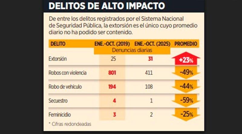 Ciudad de México 12 noviembre 2025.- A pesar de la implementación de una Estrategia Nacional, la extorsión se mantiene por encima de los niveles registrados en 2019, al mostrar un incremento acumulado de casi 23 por ciento entre enero-octubre de 2019 y el mismo periodo de 2025.
