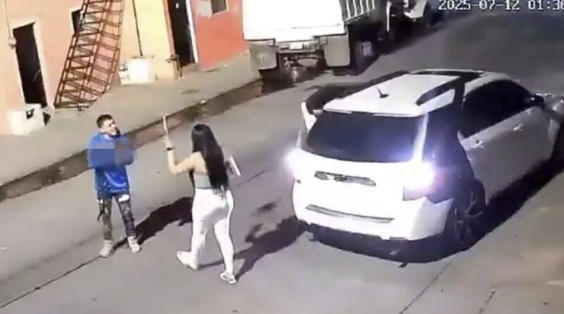En las imágenes se ve cuando el sujeto sacó un rifle de su camioneta y disparó contra la joven identificada como Karla, de 28 años. La mujer le gritaba al hombre que se fuera del lugar y golpear el auto.