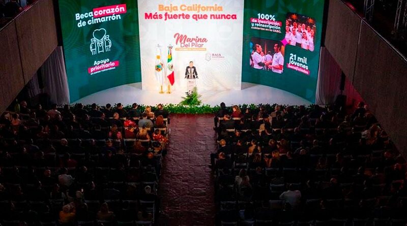Durante su mensaje, la mandataria anunció la creación de la Beca Corazón de Cimarrón, un programa estatal que cubrirá el 100% de las inscripciones y reinscripciones en la Universidad Autónoma de Baja California (UABC) para 21 mil jóvenes en situación de vulnerabilidad.