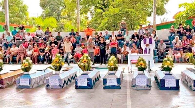 Los ataúdes con los cuerpos de los ocho policías comunitarios fueron colocados ayer en la cancha municipal de El Cortijo, donde pobladores les organizaron una misa y un homenaje. Horas después fueron enterrados.