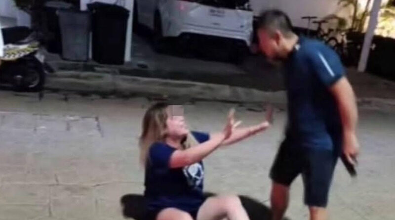 Vecinos de Residencial Palmaris captaron el momento en el que Yong Mendoza, con un arma de fuego en la mano, amenaza a la mujer que está en el suelo, quien aparentemente le suplica que no le haga daño.
