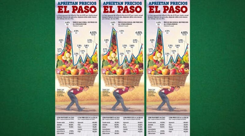 Ciudad de México 9 marzo 2026.- En febrero pasado, la tasa del Índice Nacional de Precios al Consumidor (INPC) pasó de 3.79 por ciento, en enero, a 4.02 anual en el mes referido, su mayor alza desde junio de 2025, revelan datos del Inegi.