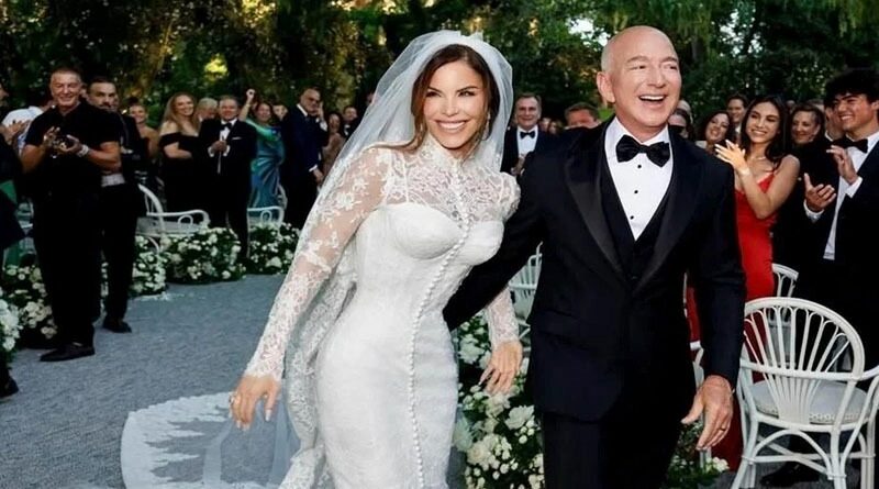 El viernes, el fundador de Amazon, de 61 años, y la periodista, de 55, celebraron su boda frente a familiares y amigos en una lujosa ceremonia, donde Sánchez deslumbró con un vestido de encaje con corsé y mangas largas de Dolce & Gabbana y Bezos optó por un esmoquin clásico.