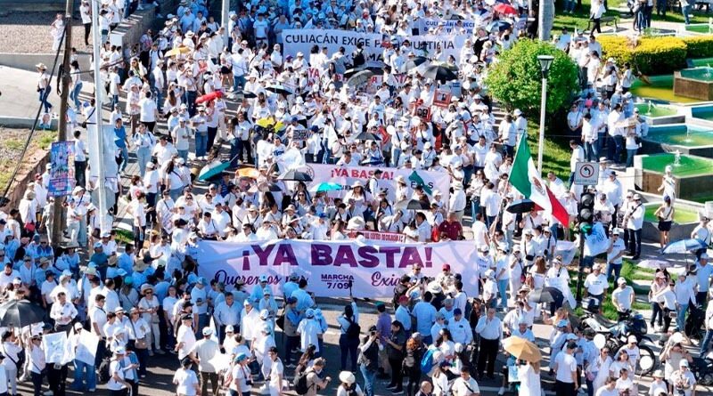 Ciudad de México 8 septiembre 2025.- Tras más de mil 800 asesinatos desde hace un año por una narcoviolencia que no cesa, miles de ciudadanos marcharon ayer en Culiacán, Sinaloa, para exigir paz a las autoridades de los tres niveles.