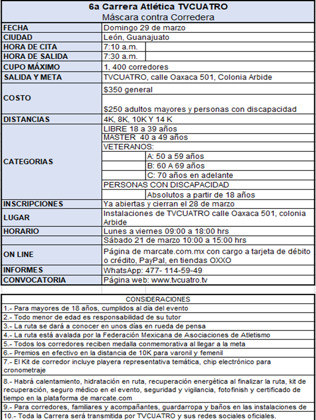 Finalmente, apuntó que los resultados del tiempo de chip de la competencia se publicarán el mismo domingo 29 de marzo de 2026, a partir de las 4:00 p.m. en www.marcate.com.mx donde podrán consultarse e imprimirse.