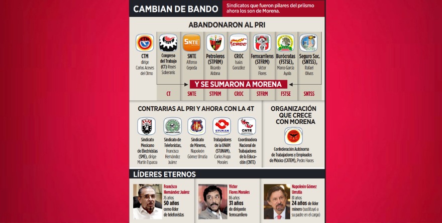Entre los sindicatos están el de ferrocarrileros, que dirige Víctor Flores desde hace 30 años; el de petroleros, que encabeza Ricardo Aldana y quien heredó el cargo de Carlos Romero Deschamps, o la Federación de Sindicatos de Trabajadores al Servicio del Estado (FSTSE), de Marco Antonio García Ayala, líder priista desde 1985, pero ahora aliado a la 4T.