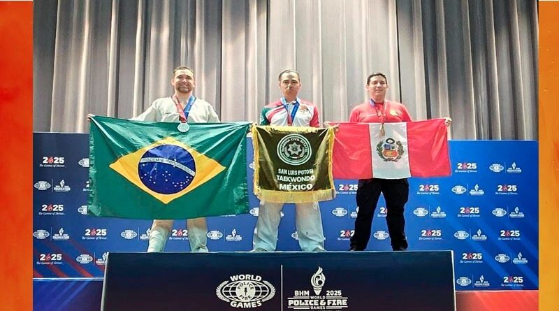 San Luis, SLP, 03 julio 2025.- El elemento operativo de la Guardia Civil Estatal (GCE) de San Luis Potosí, Omar Ezequiel Pineda Sánchez, se coronó campeón en la categoría -68 kg de taekwondo en el Mundial de Policías y Bomberos 2025, celebrados en Birmingham, Alabama.